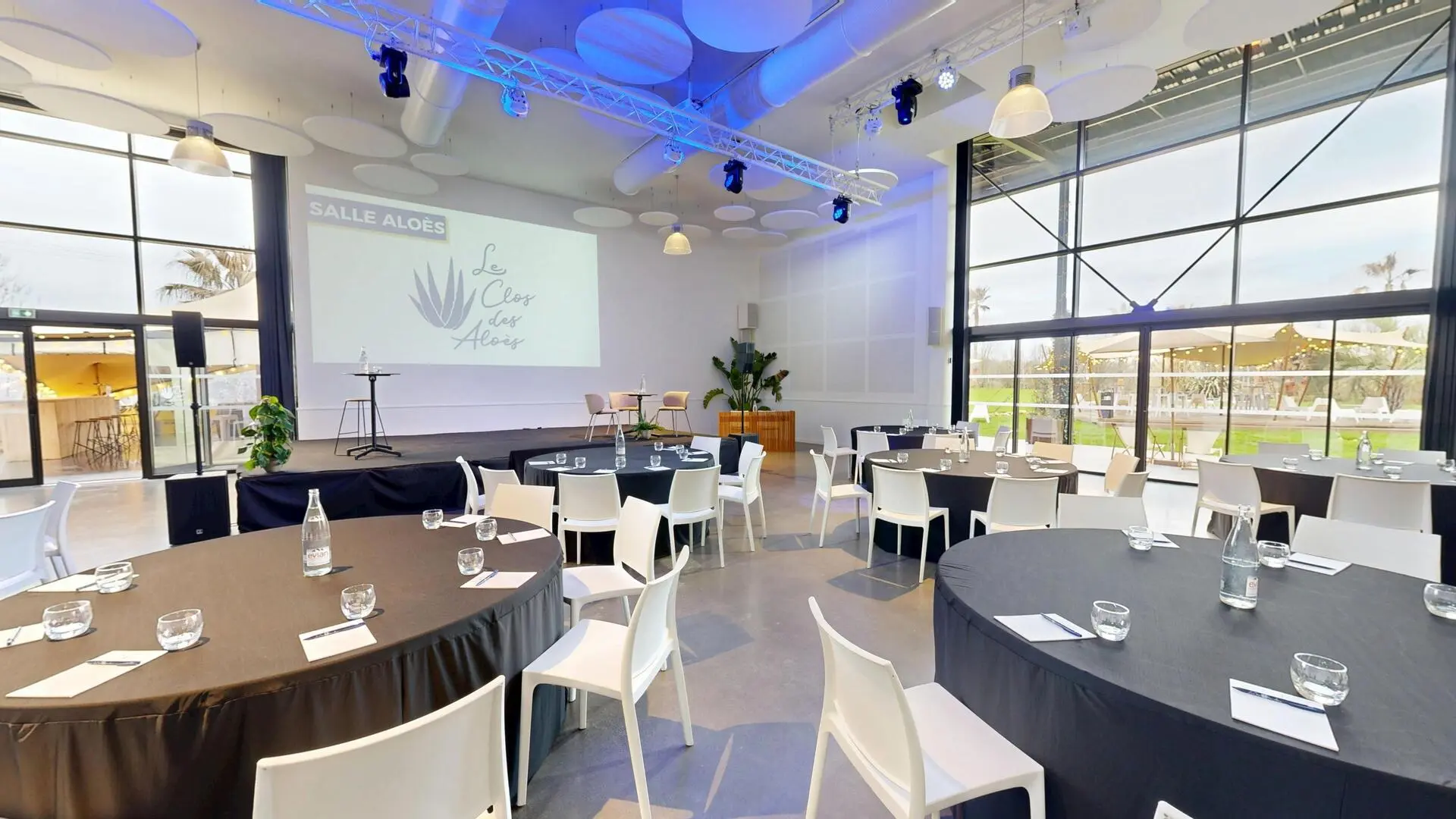 La salle Aloès, espace principal du domaine, séduit par ses volumes exceptionnels avec une hauteur sous plafond de 5,50 mètres et de majestueuses baies vitrées de 6 mètres offrant une luminosité naturelle remarquable.